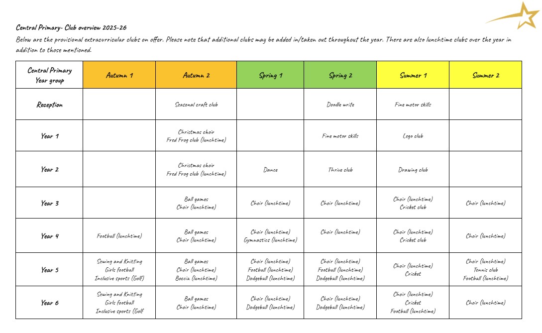 At our school, we know that learning doesn’t stop at the classroom door. Our extra-curricular clubs give children the chance to explore new interests, develop important life skills, and build confidence while having fun with their friends. From inclusive sports and music to art and computing, there’s something for everyone to enjoy. The clubs we offer may change throughout the year, depending on children’s interests and the availability of staff and providers. If you have any links to local organisations or outside agencies that might be interested in running a club with us, please let the school office know, we are always looking to add exciting new opportunities for pupils.